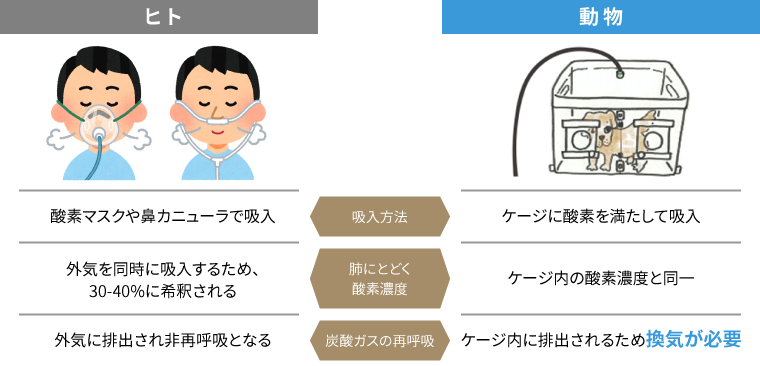ヒトでは呼気は全て大気に放散されます。動物では呼気は全てケージ内に溜まります。