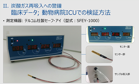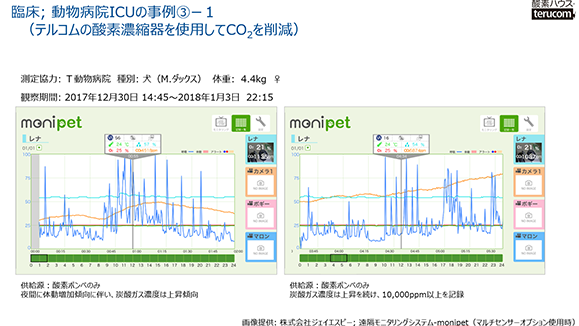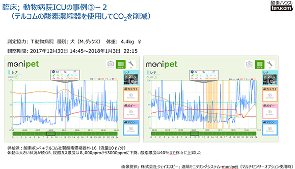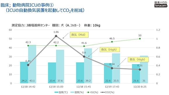 こちらの施設では「炭酸ガス蓄積」を確認されたのち、ICU装置の自動換気機能を起動されケージ内を一定間隔で換気する措置を実施されています。