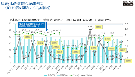 この症例でも、最高値は11,800ppmまで上昇しています。こちらの施設でも「炭酸ガス蓄積」を確認されたのち、ICU装置の扉を開放することで換気措置を実施されています。