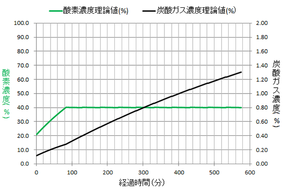 3㎏の小型犬で、空気漏れが殆ど無いケージで、酸素濃度を40%で調節しておく場合を想定したシミュレーションです。